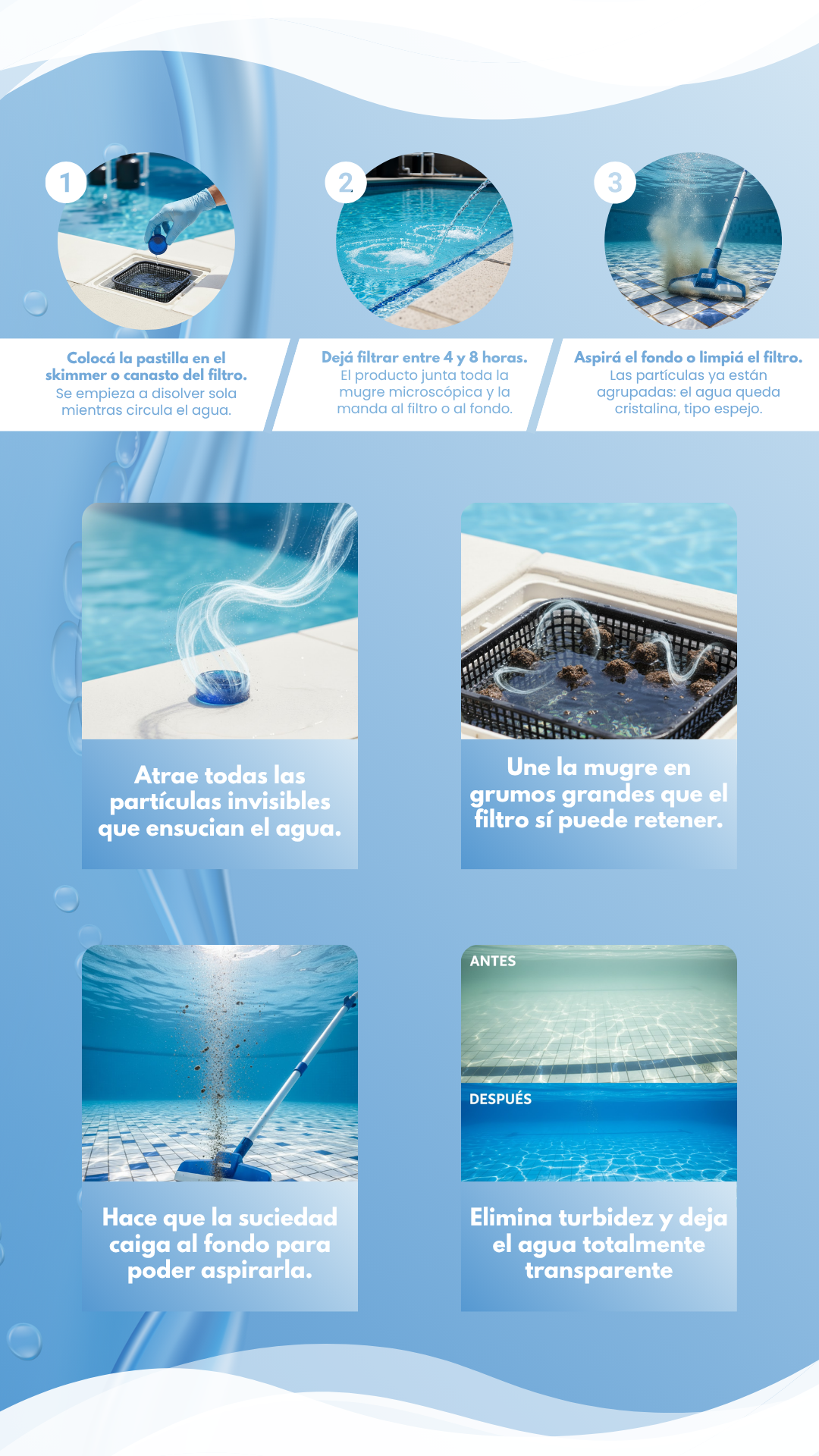 Tip CLAR Argentina: si el agua está muy tomada (muy verde o muy turbia), primero estabilizá y filtrá. El gel clarificador potencia el resultado cuando el sistema de filtrado está trabajando bien.